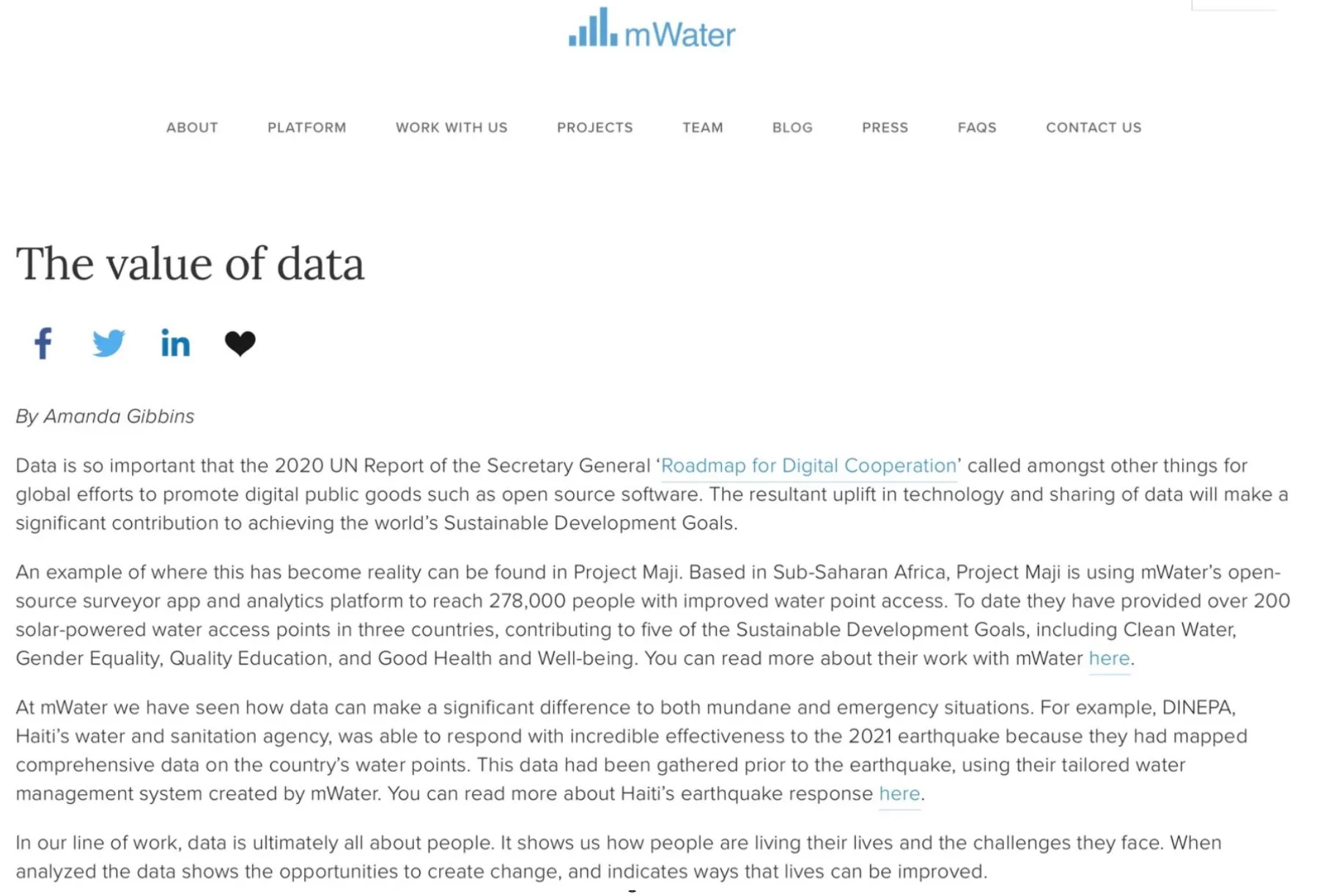 Image 1 shows a blog post on the value of data. mWater’s intention is to become a thought leader in the water and sanitation sector.