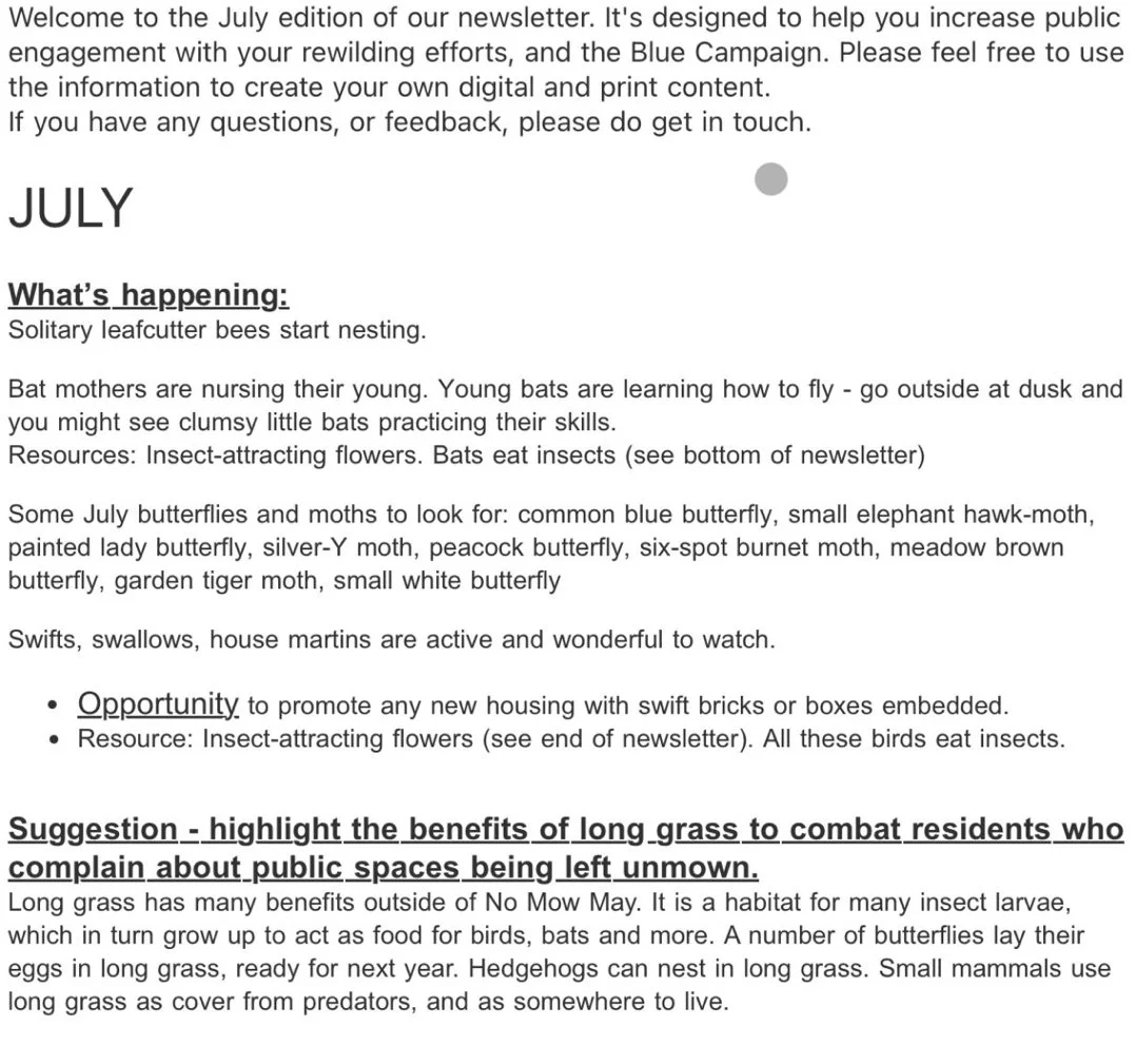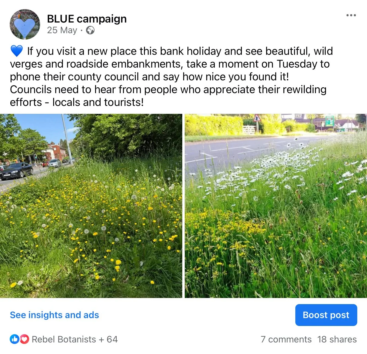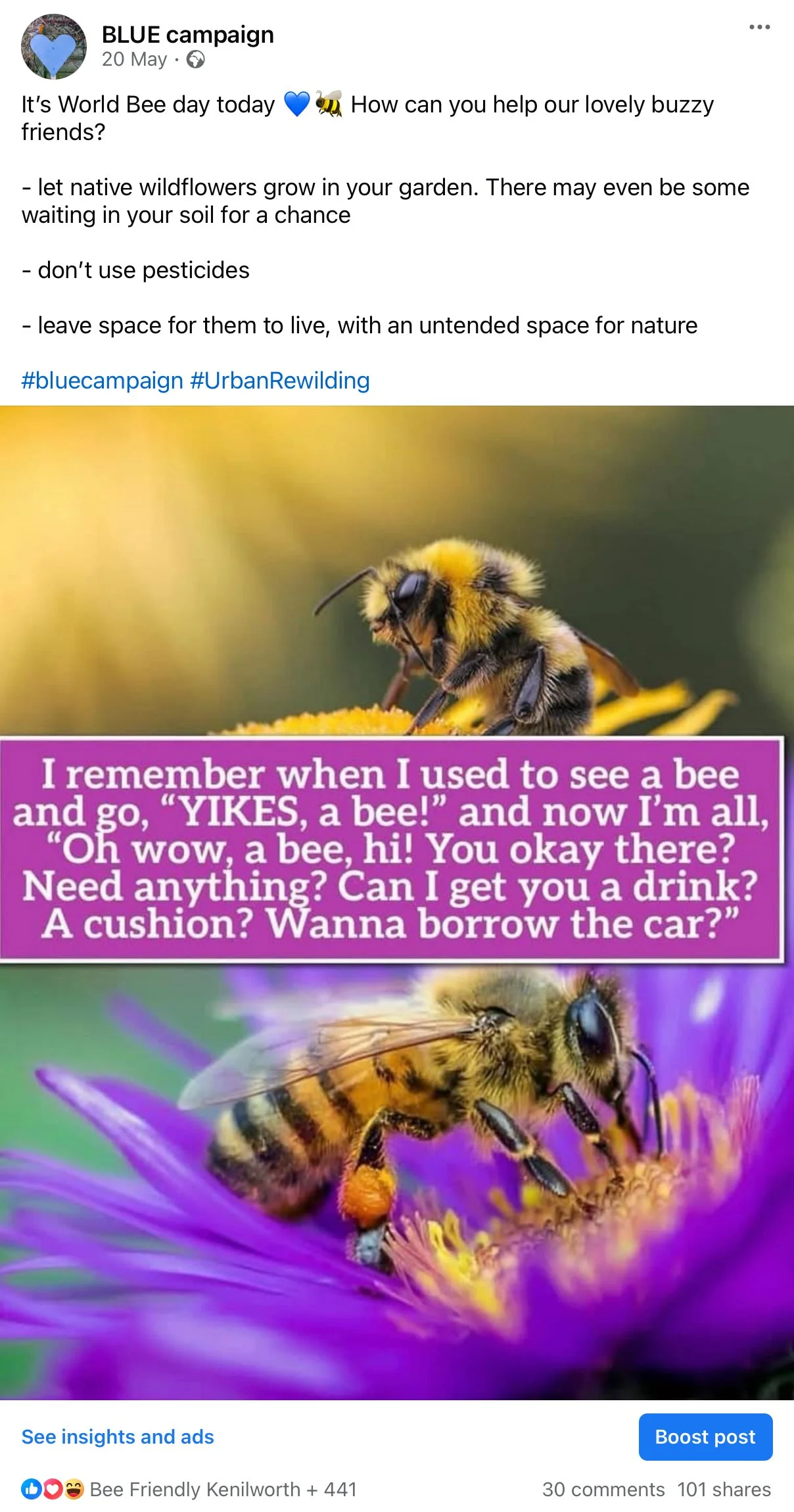 Blue Campaign needs me to turn complex information on habitat, species, and their interactions into social posts that inspire people to act. We’ve seen great success, and my work has created interest and action from councils across the UK, a housing association, garden centres, and many individuals.